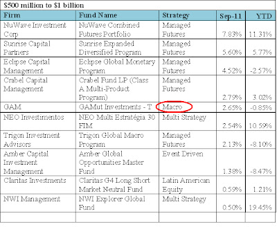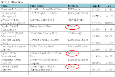 One of things that surprised me at the half way stage in the year was that so few macro managers had made much at all. Some of these big-picture managers tend to have core fixed income books, and others express their views on Chinese growth in the fx markets or in commodities. But they all may be positioned long or short, and they decide their own timing and sizing. So there is a lot of scope for the universe of macro managers to have completely different directional bets in the same market. Those that don't do much in energy, might concentrate on time spreads in softs or run a big book in credit trading. The point is they need not have correlated returns at all - in fact logically the universe of global macro managers should always have the biggest dispersion of returns amongst hedge fund strategy groups, and most of the time it does. By happenstance, taking all these different views and putting on unrelated trades across a wide selection of markets, hardly any macro managers had made good returns by the end of June this year. However the market gyrations of August and September have allowed a different story to be told for the period since.